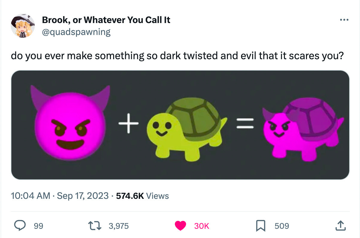 But I was tipsy last night when I emailed this to myself after talking to friends about how this random viral turtle devil emoji picture reminded me of the soft chaos of Jaeminbun. (I saw it first mentioned in the always excellent Music Journalism Insider since I’m off Xitter atm).
