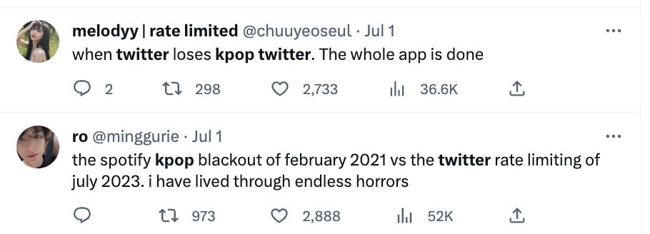 When Twitter started charging for checkmarks, it was a whole experience and reminder of what it’s like operating in a wild west, where “official” meant little. Twitter ultimately did reissue some sort of official emblems, but in that moment, I think it was made very clear that the mode of information flow in K-pop communities would have to start changing, with top-down approaches from K-pop acts on Twitter not necessarily being viable anymore. News and meme comes from Twitter and often gets disseminated, usually via screenshots, to other apps.