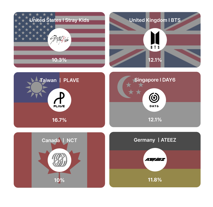 Although they didn't explain what makes a "top artist" in the deck they shared, Bunjang did break down some artists by locality for other top regions: Following Stray Kids at in the U.S. market, BTS is most popular in the United Kingdom; Plave is the most popular in Taiwan; NCT is the most popular in Canada; DAY6 reigns supreme in Singapore; Ateez are popular in Germany.